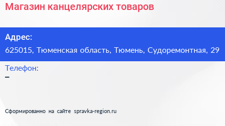 Магазин канцелярских товаров по адресу 625015, Тюменская область, Тюмень, Судоремонтная, 29 в дальнейшем Организация, размещена в следующих категориях: