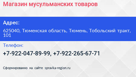 Магазин мусульманских товаров по адресу 625040, Тюменская область, Тюмень, Тобольский тракт, 101 в дальнейшем Организация, размещена в следующих категориях: