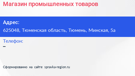Магазин промышленных товаров по адресу 625048, Тюменская область, Тюмень, Минская, 5а в дальнейшем Организация, размещена в следующих категориях:
