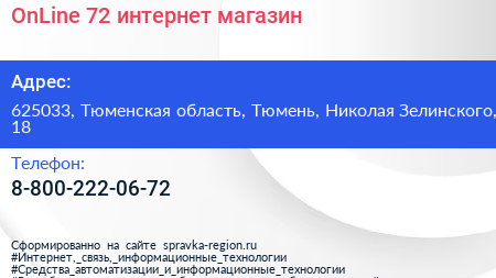 OnLine-72, интернет-магазин по адресу 625033, Тюменская область, Тюмень, Николая Зелинского, 18 в дальнейшем Организация, размещена в следующих категориях: