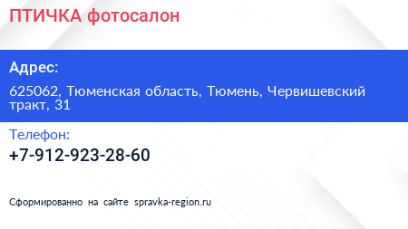 ПТИЧКА, фотосалон по адресу 625062, Тюменская область, Тюмень, Червишевский тракт, 31 в дальнейшем Организация, размещена в следующих категориях: