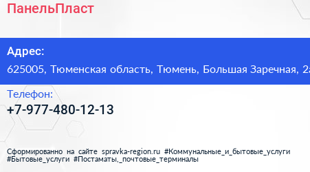 ПанельПласт по адресу 625005, Тюменская область, Тюмень, Большая Заречная, 2а в дальнейшем Организация, размещена в следующих категориях: