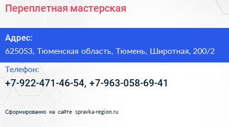 Переплетная мастерская по адресу 625053, Тюменская область, Тюмень, Широтная, 200/2 в дальнейшем Организация, размещена в следующих категориях: