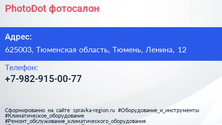 PhotoDot, фотосалон по адресу 625003, Тюменская область, Тюмень, Ленина, 12 в дальнейшем Организация, размещена в следующих категориях:
