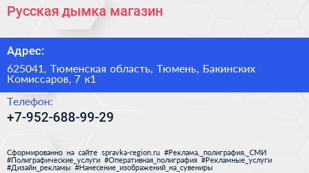 Русская дымка, магазин по адресу 625041, Тюменская область, Тюмень, Бакинских Комиссаров, 7 к1 в дальнейшем Организация, размещена в следующих категориях: