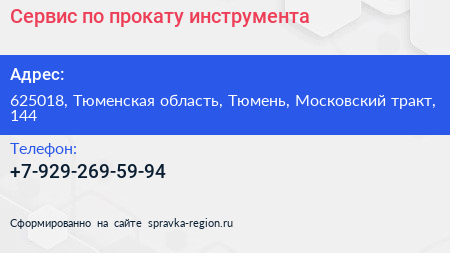 Сервис по прокату инструмента по адресу 625018, Тюменская область, Тюмень, Московский тракт, 144 в дальнейшем Организация, размещена в следующих категориях:
