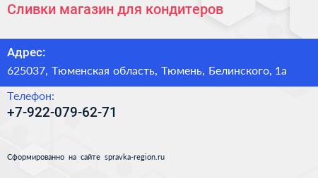 Сливки, магазин для кондитеров по адресу 625037, Тюменская область, Тюмень, Белинского, 1а в дальнейшем Организация, размещена в следующих категориях:
