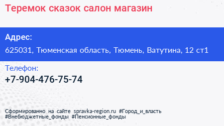 Теремок сказок, салон-магазин по адресу 625031, Тюменская область, Тюмень, Ватутина, 12 ст1 в дальнейшем Организация, размещена в следующих категориях: