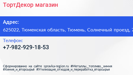 ТортДекор, магазин по адресу 625022, Тюменская область, Тюмень, Солнечный проезд, 7 в дальнейшем Организация, размещена в следующих категориях: