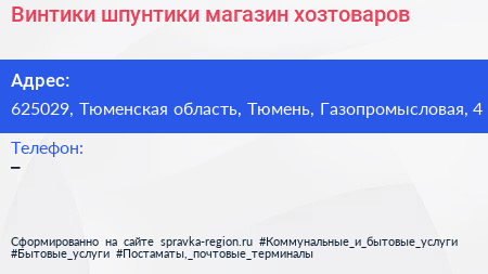 Винтики-шпунтики, магазин хозтоваров по адресу 625029, Тюменская область, Тюмень, Газопромысловая, 4 в дальнейшем Организация, размещена в следующих категориях: