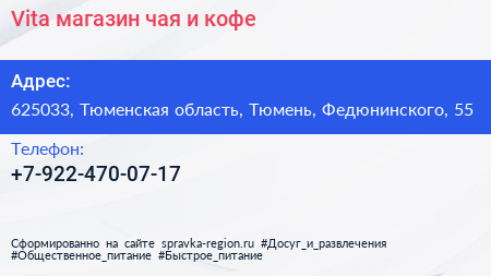 Vita, магазин чая и кофе по адресу 625033, Тюменская область, Тюмень, Федюнинского, 55 в дальнейшем Организация, размещена в следующих категориях: