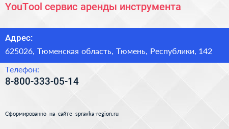 YouTool, сервис аренды инструмента по адресу 625026, Тюменская область, Тюмень, Республики, 142 в дальнейшем Организация, размещена в следующих категориях: