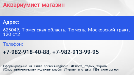 Аквариумист, магазин по адресу 625049, Тюменская область, Тюмень, Московский тракт, 120 ст2 в дальнейшем Организация, размещена в следующих категориях: