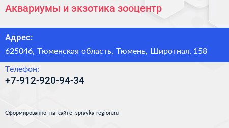 Аквариумы и экзотика, зооцентр по адресу 625046, Тюменская область, Тюмень, Широтная, 158 в дальнейшем Организация, размещена в следующих категориях: