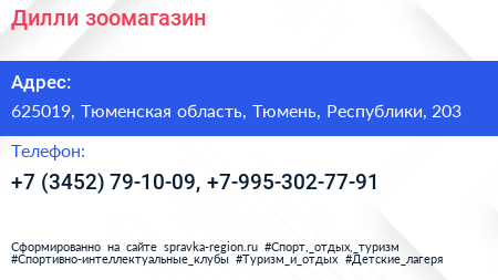 Дилли, зоомагазин по адресу 625019, Тюменская область, Тюмень, Республики, 203 в дальнейшем Организация, размещена в следующих категориях:
