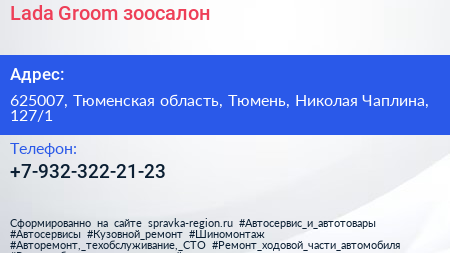 Lada Groom, зоосалон по адресу 625007, Тюменская область, Тюмень, Николая Чаплина, 127/1 в дальнейшем Организация, размещена в следующих категориях: