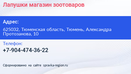 Лапушки, магазин зоотоваров по адресу 625032, Тюменская область, Тюмень, Александра Протозанова, 10 в дальнейшем Организация, размещена в следующих категориях: