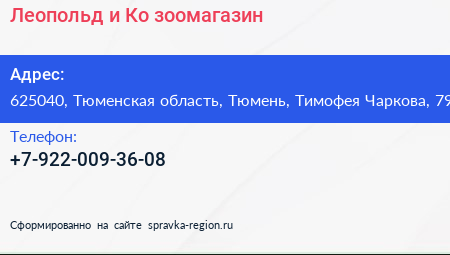 Леопольд и Ко, зоомагазин по адресу 625040, Тюменская область, Тюмень, Тимофея Чаркова, 79 в дальнейшем Организация, размещена в следующих категориях: