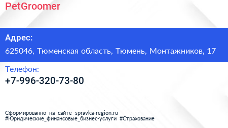 PetGroomer по адресу 625046, Тюменская область, Тюмень, Монтажников, 17 в дальнейшем Организация, размещена в следующих категориях: