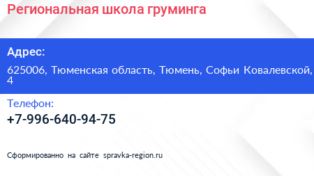 Региональная школа груминга по адресу 625006, Тюменская область, Тюмень, Софьи Ковалевской, 4 в дальнейшем Организация, размещена в следующих категориях: