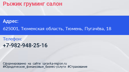 Рыжик, груминг-салон по адресу 625001, Тюменская область, Тюмень, Пугачёва, 18 в дальнейшем Организация, размещена в следующих категориях: