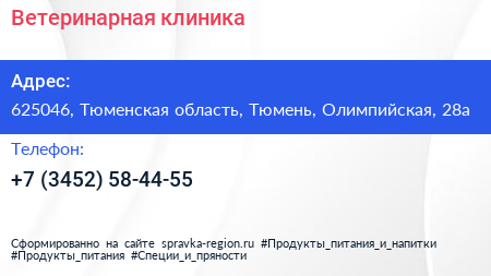 Ветеринарная клиника по адресу 625046, Тюменская область, Тюмень, Олимпийская, 28а в дальнейшем Организация, размещена в следующих категориях: