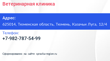 Ветеринарная клиника по адресу 625014, Тюменская область, Тюмень, Казачьи Луга, 12/4 в дальнейшем Организация, размещена в следующих категориях: