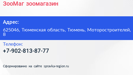 ЗооМаг, зоомагазин по адресу 625046, Тюменская область, Тюмень, Моторостроителей, 8 в дальнейшем Организация, размещена в следующих категориях: