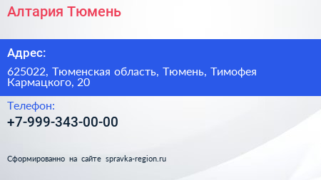 Алтария-Тюмень по адресу 625022, Тюменская область, Тюмень, Тимофея Кармацкого, 20 в дальнейшем Организация, размещена в следующих категориях: