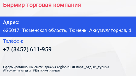 Бирмир, торговая компания по адресу 625017, Тюменская область, Тюмень, Аккумуляторная, 1 в дальнейшем Организация, размещена в следующих категориях: