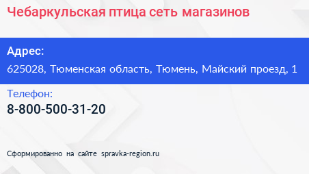 Чебаркульская птица, сеть магазинов по адресу 625028, Тюменская область, Тюмень, Майский проезд, 1 в дальнейшем Организация, размещена в следующих категориях: