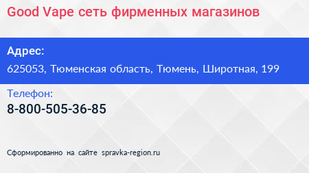 Good Vape, сеть фирменных магазинов по адресу 625053, Тюменская область, Тюмень, Широтная, 199 в дальнейшем Организация, размещена в следующих категориях: