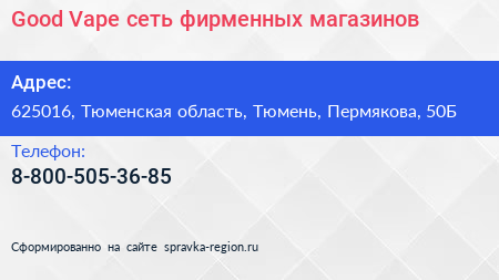 Good Vape, сеть фирменных магазинов по адресу 625016, Тюменская область, Тюмень, Пермякова, 50Б в дальнейшем Организация, размещена в следующих категориях: