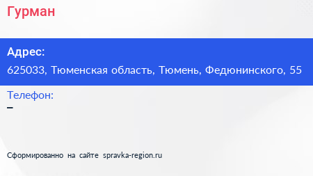 #Гурман по адресу 625033, Тюменская область, Тюмень, Федюнинского, 55 в дальнейшем Организация, размещена в следующих категориях: