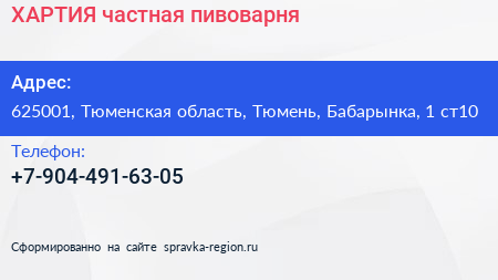 ХАРТИЯ, частная пивоварня по адресу 625001, Тюменская область, Тюмень, Бабарынка, 1 ст10 в дальнейшем Организация, размещена в следующих категориях: