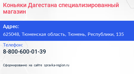Коньяки Дагестана, специализированный магазин по адресу 625048, Тюменская область, Тюмень, Республики, 135 в дальнейшем Организация, размещена в следующих категориях: