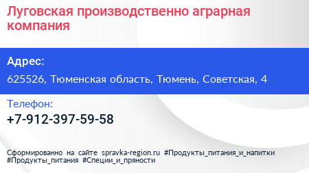 Луговская, производственно-аграрная компания по адресу 625526, Тюменская область, Тюмень, Советская, 4 в дальнейшем Организация, размещена в следующих категориях: