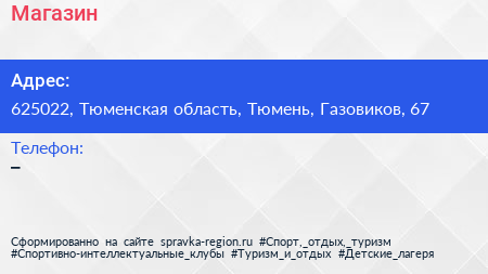 Магазин по адресу 625022, Тюменская область, Тюмень, Газовиков, 67 в дальнейшем Организация, размещена в следующих категориях: