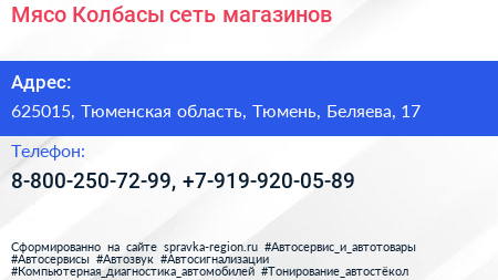 Мясо-Колбасы, сеть магазинов по адресу 625015, Тюменская область, Тюмень, Беляева, 17 в дальнейшем Организация, размещена в следующих категориях: