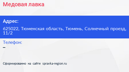 Медовая лавка по адресу 625022, Тюменская область, Тюмень, Солнечный проезд, 11/2 в дальнейшем Организация, размещена в следующих категориях: