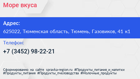 Море вкуса по адресу 625022, Тюменская область, Тюмень, Газовиков, 41 к1 в дальнейшем Организация, размещена в следующих категориях: