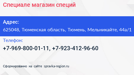 Специале, магазин специй по адресу 625048, Тюменская область, Тюмень, Мельникайте, 44а/1 в дальнейшем Организация, размещена в следующих категориях: