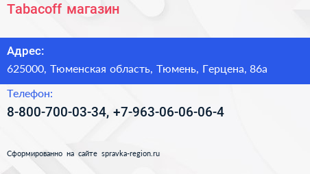 Tabacoff, магазин по адресу 625000, Тюменская область, Тюмень, Герцена, 86а в дальнейшем Организация, размещена в следующих категориях: