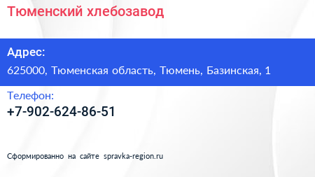 Тюменский хлебозавод по адресу 625000, Тюменская область, Тюмень, Базинская, 1 в дальнейшем Организация, размещена в следующих категориях: