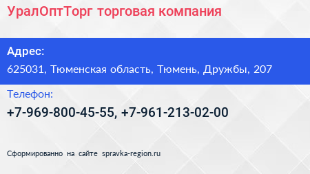 УралОптТорг, торговая компания по адресу 625031, Тюменская область, Тюмень, Дружбы, 207 в дальнейшем Организация, размещена в следующих категориях: