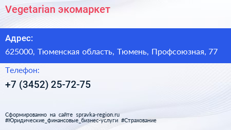 Vegetarian, экомаркет по адресу 625000, Тюменская область, Тюмень, Профсоюзная, 77 в дальнейшем Организация, размещена в следующих категориях: