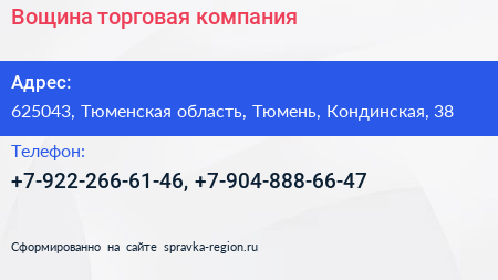 Вощина, торговая компания по адресу 625043, Тюменская область, Тюмень, Кондинская, 38 в дальнейшем Организация, размещена в следующих категориях: