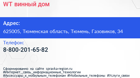 WT, винный дом по адресу 625005, Тюменская область, Тюмень, Газовиков, 34 в дальнейшем Организация, размещена в следующих категориях: