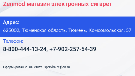 Zenmod, магазин электронных сигарет по адресу 625002, Тюменская область, Тюмень, Комсомольская, 57 в дальнейшем Организация, размещена в следующих категориях: