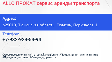 ALLO|ПРОКАТ, сервис аренды транспорта по адресу 625013, Тюменская область, Тюмень, Пермякова, 1 в дальнейшем Организация, размещена в следующих категориях: